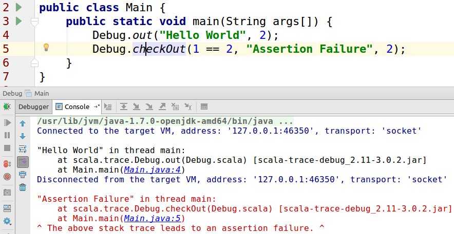 scala-trace-debug is a hyperlink based print debugging system designed to work with any IDE or text editor that supports stack trace highlighting. It had its origins in a print debugging system developed in Java for undergrads, and evolved into something production ready. Using compile-time macros in Scala and run-time switches in Java, scala-trace-debug makes your print statements and assertions easier than ever to locate. Use it to append a "smart" hyperlink to your sourcecode, avoiding the need to "grep", and turn it off by recompiling with the ENABLE_TRACE_DEBUG